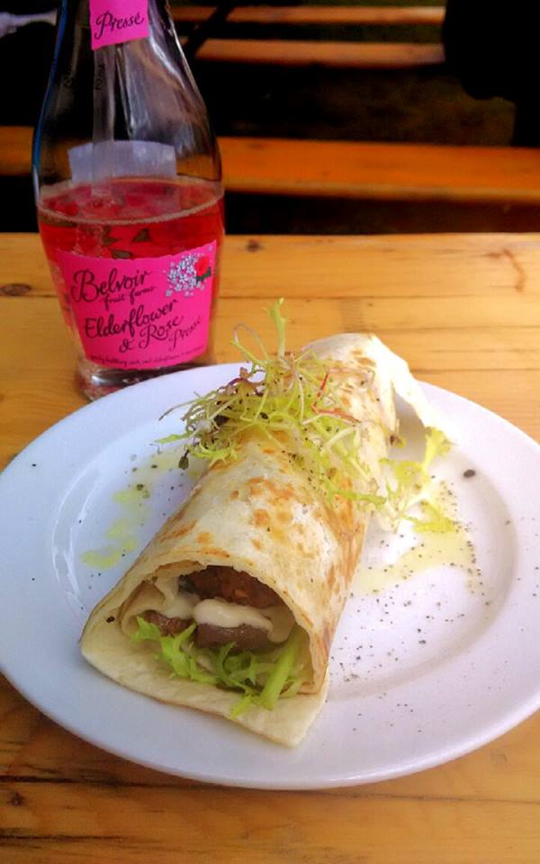 falafelový wrap, kořeněný lilek, citronovo-česneková emulze + bezová limonáda s růžemi