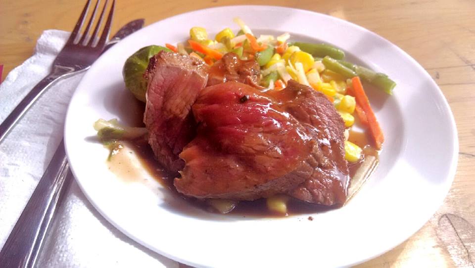 steak z bizona, demi-glace z višní, julienne zeleninka